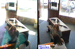 从上述图片可以看出,基于Pixim 技术摄像机,可以清晰记录小偷从室外进入珠宝店、行窃、离开全过程。通过录像资料可以准确查处窃贼进入时间和离开时间、去向及可以辨认的面部细节。
