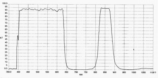 这是滤光片对每个波长光的穿透率,横轴是波长,以奈米(nm)表示,纵轴是穿透率,我们看到从380nm-645nm 穿透率是约93% ,刚好就是可见光的范围(紫-靛-蓝-绿-黄-橙-红),就是彩虹的颜色嘛! 600多nm是红色光,在它往右以”外”,就叫”红外线”,是”红色以外的光” 不是红色的光,因为眼睛已经看不到了,再来,380nm左右我们眼睛看到的是紫色,在380nm往左以”外”,就叫”紫外线”,眼睛一样看不到,但会照伤我们的皮肤,让青藏高原同胞晒的黑黑的,脸颊红红的。