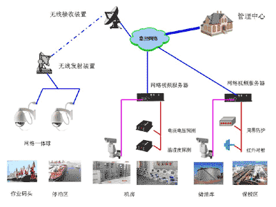 在监控前端采用网络视频服务器或网络一体球,其中对于作业码头,船舶停泊区采用大变倍镜头,可对远距离物体实现细致的监控。在机房环境中采用网络视频服务器,可以接入1路/2路/4路视频点,还可以对电流电压,温度湿度进行监控,全方位保障机房安全。在油库、保税区安装报警设备,可以接入周界防范、红外对射等多种报警设备,保障重要地区的安全。