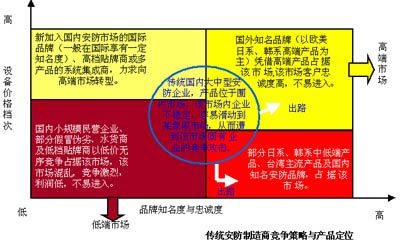 整体市场结构布局合理、总供给与总需求基本平衡。市场潜力巨大、需求旺盛,但门槛较低、竞争激烈、市场秩序混乱。产品市场正由沿海和省会城市,向内地和边陲扩展。安防企业人员规模与资金规模均以中小型企业为主(但年销售额不足1000万的小企业占90%以上)。国内厂商的优势在逐渐增强。技术与生产能力已有明显改善,得到最终用户和工程商认同,价格为其主要竞争优势,但与国外产品还存在一定技术、品牌差距。国外厂商品牌优势巨大。主要为日本、北美、欧洲、台湾、韩国品牌。目前,在大部分细分市场竞争中,国外厂商仍占据优势。