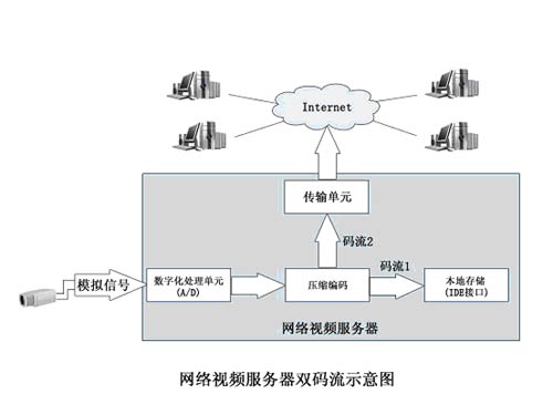双码流,顾名思义,在视频服务器中同时并存两种码流。双码流是通过在编码端采用两种格式进行分别编码来实现的,对包括芯片在内的硬件系统和软件操作系统提出了非常高的要求。目前的解决方法有两种,一种是采用更高主频的芯片来进行编码压缩处理,通常至少要达到500M,这样做的好处是成本相应稍低;另一种则是采用两片芯片,一片芯片做一种码流,这样做的优势则在于稳定性比较高。