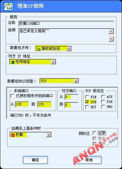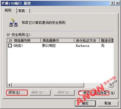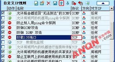 方法1 防火墙拦截因为防火墙有拦截数据的功能,所以如果我们利用该功能将通往135端口的接收和发送数据全部拦截下来,就可以阻止他人连接我们的135端口了。我们以天网防火墙为例子,因为用的人多,操作也简单,一看就明白了立刻行动吧!a.打开天网防火墙,可以见到如图所示的界面,单击“自定义规则”,我们要自己来增加一个规则,所以再单击“增加规则”。 b.现在可以看到一个增加IP规则的对话框。规则的名称和说明没有限制,喜欢就好不过为了方便查看,我们就叫“拦截135端口”。 数据包方向:接收或发送(同时阻止通过135端口接收和发送数据)对方IP地址:任何地址数据包协议类型:TCP (因为135端口是一种TCP协议端口)本地端口:从135到135(定义了要拦截的端口只为135端口)对方端口:从0到0 (端口为0时为对方的任何端口)TCP标志:SYN当满足上面条件时:拦截好了,一个IP规则制作完成确定! c.如图:把我们刚刚制作好的规则放到同类规则的最顶端使用向上箭头直到不能再向上,并选上勾,然后保存(这一步非常关键)其它端口的关闭设置方法类似,如要开放端口,把‘拦截’改为‘通行’就可以了。 方法2 自定义安全策略如果我们手头暂时没有防火墙工具的话,那么可以利用Windows服务器自身的IP安全策略功能,来自定义一个拦截135端口的安全策略。a.打开控制面板,找到管理工具里面的本地安全设置。 b.看到如图的界面,我们选择左边的IP安全策略,在本地机器。 然后在右边空白处单击右键,选择创建IP安全策略。出现了一个设置向导。点击下一步 名称也是看自己喜欢了,我们还是叫拦截135端口下一步去掉激活默认响应规则的勾,下一步 点击完成,我们就创建好了, 接下来设置我们用这个规则来干什么,我们是拦截135端口所以添加一个IP安全规则,单击添加(不需要向导所以去掉添加向导的勾) 在IP筛选器列表中,我们添加一个新的。单击添加...在这个对话框中名称还是自定义,去掉添加向导的勾,然后单击添加...准备开始设置规则了:在寻址标签中,设置:源地址:任何IP地址目标地址:我的IP地址 在协议标签中,设置:选择协议类型:TCP设置IP协议端口: 从任意端口,到此端口:135确定后可以看到筛选器中多出了一条。关闭后在IP筛选器列表中选择我们刚刚建立的拦截135端口。我们建立好了可是电脑还不知道我们要怎么使用这个规则,不要紧,只要在筛选器操作标签中添加一个操作就完成了。单击添加...只用在安全措施种选择阻止就ok了(可以在描述中设置名称)同样选上这个操作。确定后我们就完成了99%!由于windows默认IP安全策略中的项目是没有激活的,所以我们要指派一下,点击指派。完成99.9%重新启动!100%其它的端口设置类似,多试试看!PS:如果没有IP安全策略可以在控制台中新建在运行中输入:mmc回车然后在控制台按钮中选择添加删除管理单元然后单击添加...在其中选择:IP安全策略,再添加即可,这时的操作就和上面一样了。