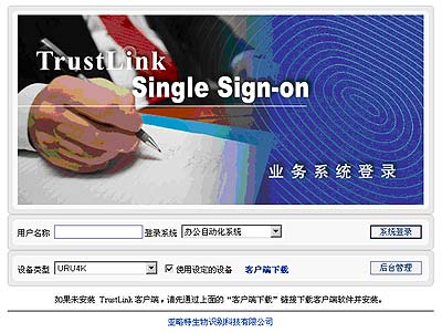 SingleSign-On,即单点登录,是指用户在一处登录后完成身份验证,即可访问其他所有相互信任的应用系统,而不需要再次认证。 TrustLinkSingleSign-On系统是亚略特生物识别科技自主开发的一款基于指纹识别的单点登录系统。它利用指纹特征实现了个体身份的识别,可支持多种平台和多种开发环境。 实现简介 本系统利用TrustLinkPlatform通过指纹识别、比对、认证实现了对用户身份的确认。用户向存储有用户ID、密码、指纹等信息的TrustLinkSSO输入指纹,SSO对指纹进行比对验证。若通过,则SSO向应用系统提交ID、密码等信息,实现用户登录;否则,返回SSO的用户输入界面,请求用户重新输入。其流程如下图所示: