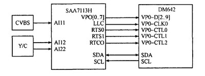 SAA7113H为9bit视频解码器,其内部有由视频源选择、反混叠滤波器和ADC组成的两通道模拟预处理电路、增益控制、时钟发生电路(CGC)、多标准数字解码器、亮度饱和度控制电路等组成。它支持PAL、NATSC等多种视频输入格式,输出支持标准的ITU.656YUV4∶2∶28bit格式,通过I2C总线进行控制,只需一个24.576MHz外部晶振,采用3.3V电源、具有小于0.5W的功耗。SAA7113H与DM642接口见图2。