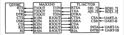 TL16C752B是UART收发器,最高波特率可以达到3Mb/s(使用48MHz时钟源时),其内部具有64byte发送/接收FIFO,接收FIFO的启动和停止可通过软件编程实现,支持多种波特率、多种串行数据格式。DM642与其连接采用EMIF控制,地址线A0~A2、数据线D0~D7、读写控制信号IOR/IOW与经过驱动的总线相连,而选通信号CSA/CSB由GAL产生。TL16C752B与Q2358C模块之间通过MAX3243进行电平转换连接。图4给出一路串行接口连接方式。