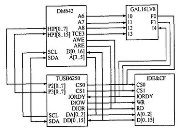 本系统中对采集视频要进行本地数据存储,采用CF卡或IDE硬盘来保存数据,在通过USB2.0将保存于CF卡或DE硬盘中的数据在需要时读出。DM642与DE接口通过GAL16LV8产生的信号进行控制。TUSB6250采用内嵌8051内核的USB2.0到ATA/ATAPI桥接器,其完全兼容USB2.0标准,支持八个可配置终端(四路输入和四路输出)。内部集成USB存储设备传输协议,与ATA/ATAPI设备无缝连接。内部集成的60MHz8051微处理器指令速度可达30MIPS,40kbyteRAM可灵活的配置为数据或代码RAM,13个通用I/O口能进行各种通信和控制使用,并有I2C接口。在本系统中通过I2C和HPI总线实现DSP和TUSB6250之间的通信。DE及USB部分接口见图5。