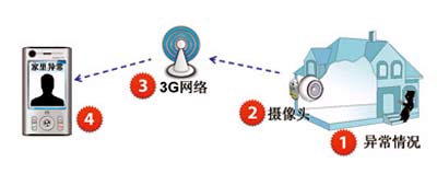 3G技术的发展为视频监控系统走入家庭提供了机遇。采用低成本的家庭视频摄像头终端,通过3G无线网络,向在外办公的用户手持终端传输实时的视频信号。