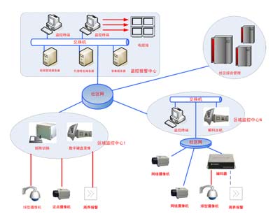 某些区域根据根据监控报警点相对分散结合完善的网络布线实际情况,宜建设基于网络的数字化监控报警系统,前端采用网络摄像机或将模拟摄像机、报警探头接入网络编码器,通过社区网络将数字信号传回区域监控报警中心,区域监控报警中心以网络视频监控管理系统为核心,实现数字视频的切换、控制、管理、显示和录像存储。