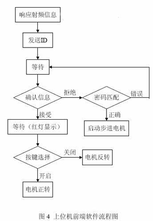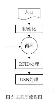 下位机的主要功能是确保正确的ID被发送并保证在接收确认信息后可以正确操作直流电机和步进电机。上位机包括了射频收发、USB接口、WDM驱动和应用程序,其中射频收发和USB接口程序处于阅读器上,用于上位机前端,全部程序包括Mainloop.c、Init_system.c、Usb.h、Charp9.c、Isr_RFID.c、Isr_USB.c、AT89S52.h、nRF2401.h、ISP1581.h等,其中Isr_RFID.c负责处理射频收发,而Isr_USB.c负责处理USB接口数据传输[6-7]。主程序流程图如图5所示: