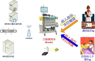 藉由先进之网络通讯及信息科技,结合RFID、UD药包条形码之读取装置并与护理系统整合的『行动护理车』,建构自动化管理系统。进行病人辨识、给药核对与医嘱异动等,提高病人安全与医疗照护质量,同时运用RFID的非接触之特性,有效管理多重抗药性及开放性肺结核强制治疗病人在病房区内之活动,以防此病人离开管制区域,能有效管理避免造成传染及感控事件发生。达成(1)节省人力成本、(2)快速的病人监控及警示、(3)降低医疗成本及维持医疗质量、(4)提升服务满意程度等目标。