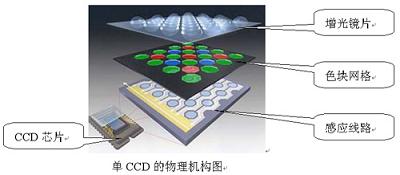 3CCD,顾名思义,就是一台摄像机使用了3片CCD。我们知道,光线如果通过一种特殊的棱镜后,会被分为红,绿,蓝三种颜色,而这三种颜色就是我们电视使用的三基色,通过这三基色,就可以产生包括亮度信号在内的所有电视信号。如果分别用一片CCD接受每一种颜色并转换为电信号,然后经过电路处理后产生图像信号,这样,就构成了一个3CCD系统。