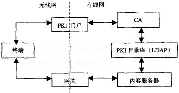 WPKI由终端、PKI门户、CA、PKI目录服务器等部分组成密钥管理体系。在WPKI的应用中,还设计WAP网关和数据提供服务器等服务设备。WPKI的基本结构如图1所示。