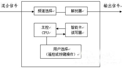 3、加扰和受控解扰功能:有线电视台将节目加扰,居民终端智能卡收费机在智能卡的控制下对信号解扰。