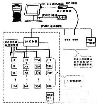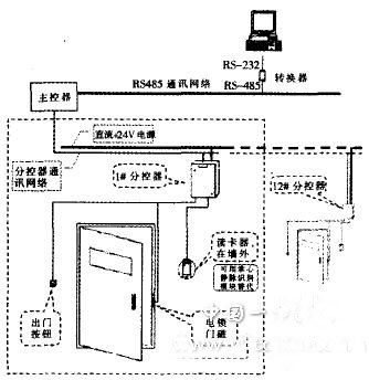 使用掌心静脉识别的网络门锁包括主控制器,分控制器,键盘读卡器,转换器,修改器,发卡器,电源系统,管理软件,卡片,电锁,布线网络,电脑, UPS不间断电源以及掌心静脉识别模块及其配套软件等,其连接情况如图1所示。