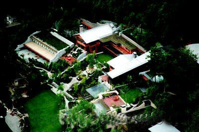 这幢豪宅前方俯瞰烟波浩淼的华盛顿湖,背后深入湖畔东岸的一座山丘,属于“掩土建筑”,犹如一座堡垒要塞。豪宅与西雅图市遥遥相对,邻近雷蒙市的微软公司总部。建筑物地上四层,外观呈现“西北太平洋岸别墅”风格,林木蓊郁、气象万千。