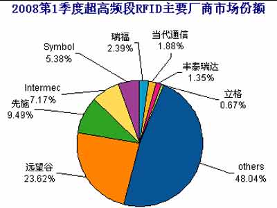 本季度中,UHF频段排名前三的厂商市场份额达到40.3%,与上一季度市场集中度基本持平,新年第一季度由于雪灾等因素影响各厂商的市场表现一般。UHF频段远望谷市场份额比较高,主要原因是在远望谷07年第四季度的项目还在延续交付,而先施市场分额下降较多。本季度中微波频段市场比07年第4季度有所下降,主要原因是相关项目的开展受到雪灾等因素的影响。