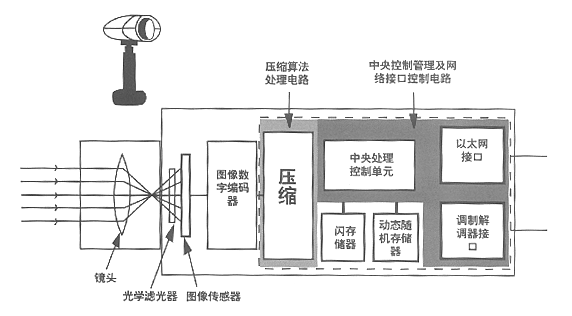 从外部结构来看,目前市面上的网络摄像机有一种为内嵌镜头的一体化机种,这种网络摄像机的镜头是固定的,不可换;另外一种则可以根据需要更换标准的C/CS型镜头,只是C型镜头必须与一个CS-C转换器搭配安装。但从内部构成上说,无论是哪种机型,网络摄像机的基本结构大多都是由镜头,滤光器、影像传感器、图像数字处理器、压缩芯片和一个具有网络连接功能的服务器所组成。