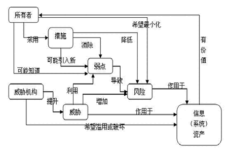 信息安全管理的本质,可以看作是动态地对信息安全风险的管理,即要实现对信息和信息系统的风险进行有效管理和控制。标准ISO15408-1(信息安全风险管理和评估规则),给出了一个非常经典的信息安全风险管理模型,如下图一所示:
