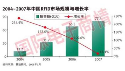 07年中国RFID市场规模呈现平稳增长态势,但增幅大幅度下滑。