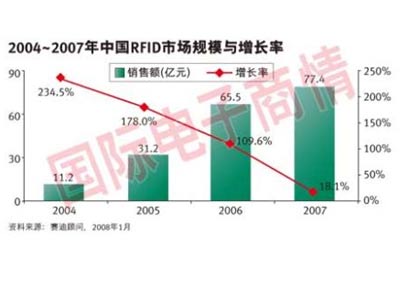 07年中国RFID市场规模呈现平稳增长态势,但增幅大幅度下滑。