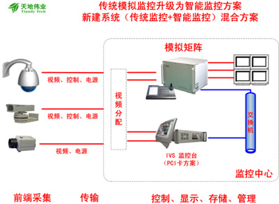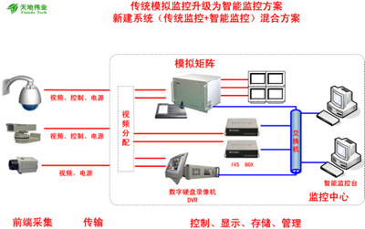 解决方案二:对于传统模拟监控(已建或新建),选择重点、高危监控目标和场所,针对此部分图像进行分析功能,主动监控,将预警、警情实时发给模拟矩阵和DVR,完成快速切换和录像,选择智能分析硬盘录像机,解决方案如图所示: