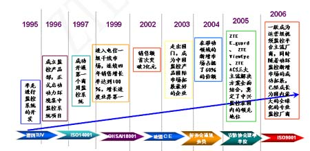 中兴通讯从事监控系统集成的历史,可以追溯到上世纪90年代。从1995年率先进行监控产品的开发,次年,成立监控产品部,并随之启动动力设备及环境集中监控系统项目。1999年,中兴监控进入电信一级干线市场,并且保持了连续四年销售增长率100%的纪录。2003年,中兴监控走出国门,向海外市场进军。2006年国际销售突破1亿元,国内销售近4亿元。