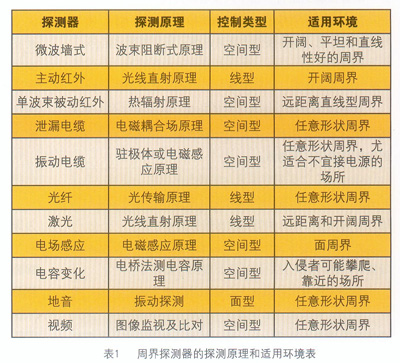 表1简要列出了目前应用较多的几种单技术周界探测器的探测原理和适用环境;据此可以对有可能组合在一起的两种探测技术在探测原理和适用环境上的相容性进行分析。