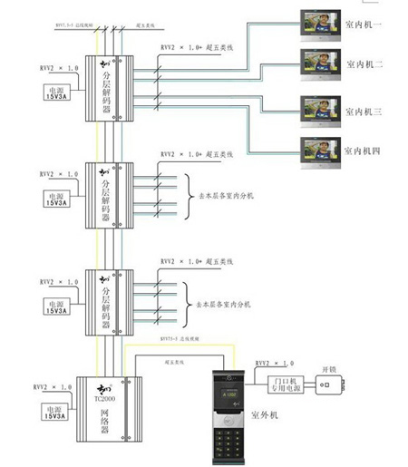 栋内部分包括了室内机,楼层分配器,门口机,和用于联网的网络连接器,之间用传统的电缆进行链接,由于距离短,信号质量可以得到保证。