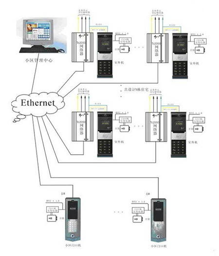 联网部分的器材相对简单,只需要一些标准的路由器和超五类线组成局域网即可,管理中心电脑也是和局域网链接,由于采用的是TCP/IP的联网技术,管理中心可以设在小区的任何角落,不会像模拟系统一样,从布线成本考虑一定要放到小区的中心位置。
