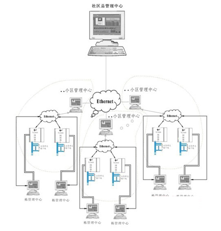 现在小区的规模发展越来越大,有些小区的半径已经达到10公里,由于小区太大,分期开发,往往需要独立设置管理中心,等开发完后再设置总管理中心,实现多管理中心分级管理,模拟系统是很难适应这种需求的。而半数字系统实现起来就相对容易,具体架构图如下,各分管理中心处留一个连接TCP/IP的RJ45接口即可。