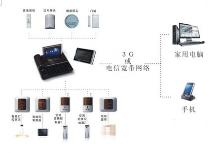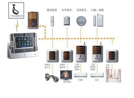 从图上可以看出,无线智能家居系统在小区内部的组网相当简单,只需要无线家庭智能终端和门口机两种硬件器材,其主要的核型部分集中到了无线智能家庭网上,家居智能成了系统开发的核心,简化的具有基本家庭智能的家庭智能网架构图如下所示: