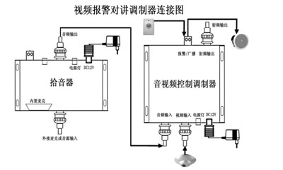 摄像机输出的视频信号、拾音器输出的音频信号经过音视频控制调制器调制成高频信号,常开方式报警信号(短路报警)传输到终端设备,同时可分别接收由终端设备发出的音频广播信号或RS485控制信号或12V控制电源、电话信号等低频信号。