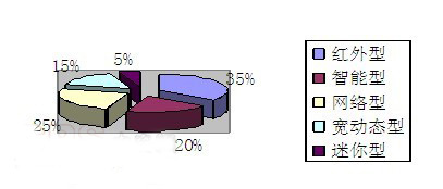 从球机功能上可分为红外型、智能型、网络型、宽动态型、迷你型。其中红外型占35%、智能型占20%、网络型占25%、宽动态型占15%、迷你型5%(如图5)。