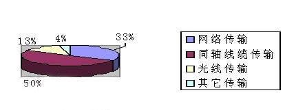 按照传输方式可以分为网络传输、同轴电缆传输、光纤传输。其中,在高清网络概念逐渐受到行业青睐的情况下,基于网络架构的传输方式已然有追赶并超越同轴线缆传输之势。根据调查数据显示,网络传输型球机占33%,同轴线缆传输型球机占50%,光纤传输型球机占13%,其它占4%(如图6)。