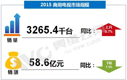 目前,中国商用电视市场发展已经相对成熟,2015年国内GDP同比增长6.9%,创近年来新低,与此同时,商用电视市场增长趋缓;根据奥维云网(AVC)全年市场监测数据显示,2015年全年,商用电视市场整体规模达3265.4千台,同比增长0.7%,基本持平;销额58.6亿元,同比下降7.5%,销额的下降主要因为电视硬件成本一再触底,利润率持续降低,规模呈 “量增额降”态势。