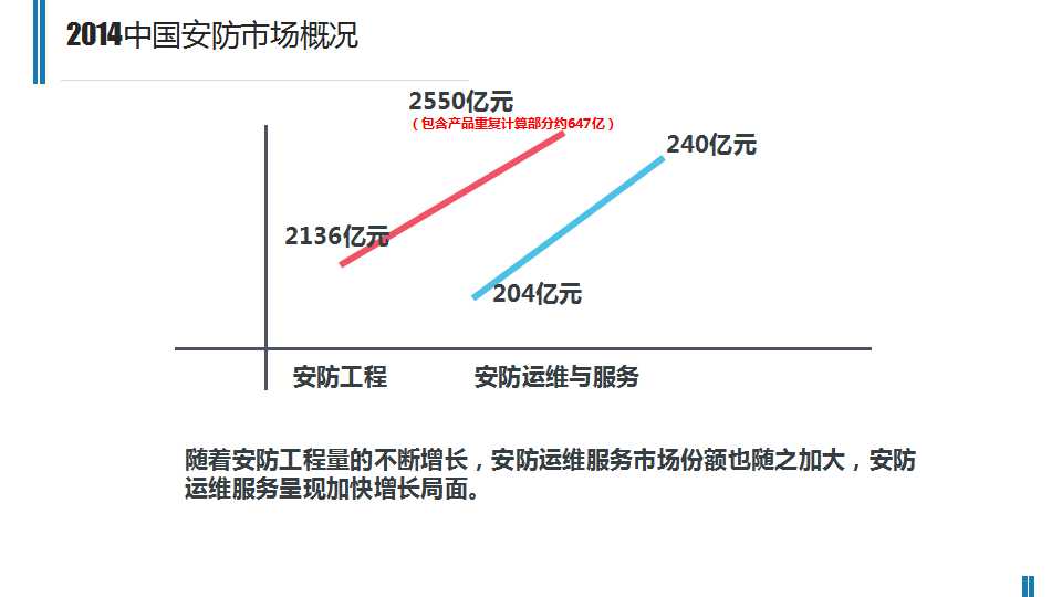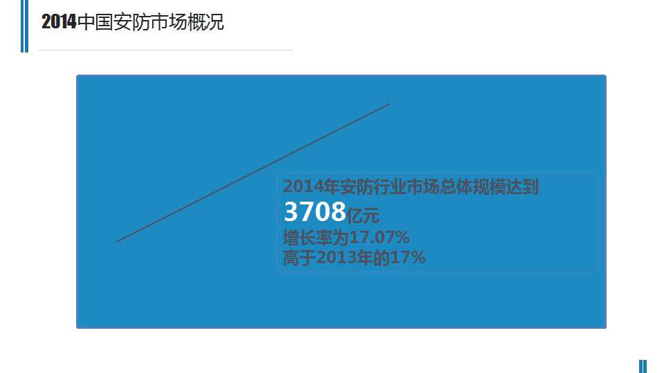 2014年安防行业市场总体规模达到3708亿元随着安防工程量的不断增长,安防运维服务市场份额也随之加大