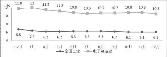 ▲图2 2015年电子信息制造业与全国工业增加值累计增速对比