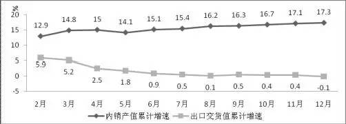 ▲图5 2015年电子信息制造业内外销产值累计增速对比