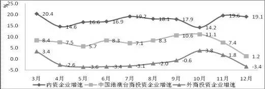 ▲图8 2015年电子信息制造业不同性质企业销售产值分月增速对比