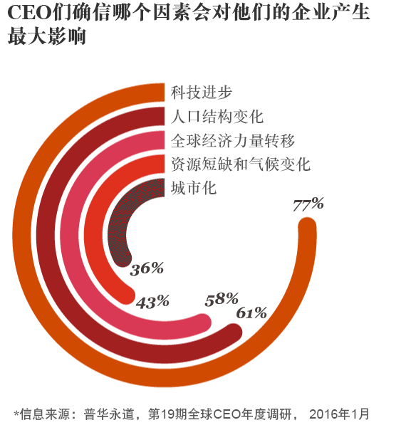 根据普华永道今年公布的全球CEO年度调研,对于问题“未来五年里,什么因素最有可能塑造行业利益相关者的业务期望”,CEO们明确表态,指出科技进步是目前最有影响力的因素。