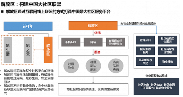 解放区是花样年集团旗下又一力作,旨在通过利用互联网线上联盟的方式打造中国最大社区服务平台。解放区是花样年整个社区平台的延伸,与彩生活相辅相成,突破彩生活的物理局限,是彩生活、彩之云的互补。解放区不进行物业收购,完全依靠物业联盟和互联网扩张的轻资产运营模式。依托手机APP、网站和联盟商家运营管理平台,整合传统社区物业、社区周边商家和消费供应商,为社区居民提供优质的生活服务。