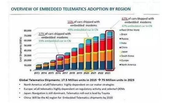 2016年我预测中国市场达到19%的渗透率,也就是19%的新车会搭载前端联网模式,我们预测相比其他同类公司来说略微乐观一些。在2020年这个数字会达到49%,全球达到55%。2023年中国会达到67%,届时将成为全球最大的车联网前装市场。