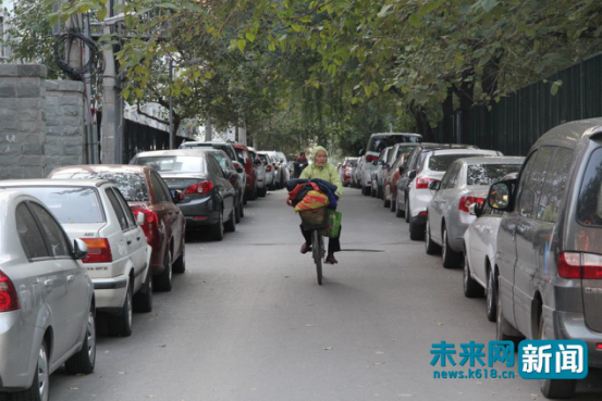 北京北三环一小区外的道路两旁几乎全天停满车辆。