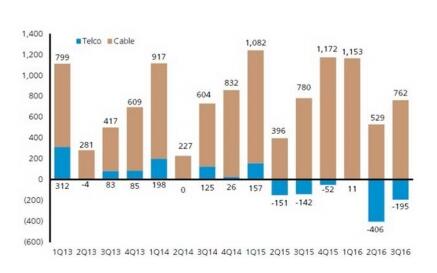 第三季度,美国顶级电信运营商流失了约15万宽带用户,与去年同期的14.5万相比数量进一步增加。事实上,在过去的一年半中,有5个季度电信运营商的净增宽带用户数都是负数。在电信运营商中,Frontier Communications流失用户9.9万,为其史上最严重的用户流失。其他电信运营商如Centurylink和AT&T用户数也有显著减少,前者流失用户数4万,后者为2.3万。