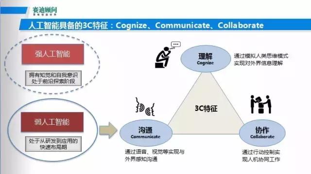 对人工智能赛迪有自己的定义。现在很多业界人士都对强人工智能和弱人工智能有很清晰的定义,其实强的人工智能还是存在比较遥远的探索阶段,它是关于自我意识方面比较深层次的探索,我们关注最多的是弱的人工智能。弱的人工智能有三个定义,它主要具备了3C特性,第一个就是人工智能通过深度学习和神经网络算法,能够对人类的一些知识感知实现机器理解。第二个就是机器视觉和语音识别,能够通过机器对外界的行为进行一个感知。第三,协作的关系。这个协作是指运动器官,通过机器外部控制器完成人类对他指令行为习惯的驱使,这是3C的特征。