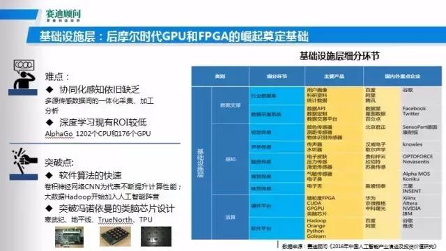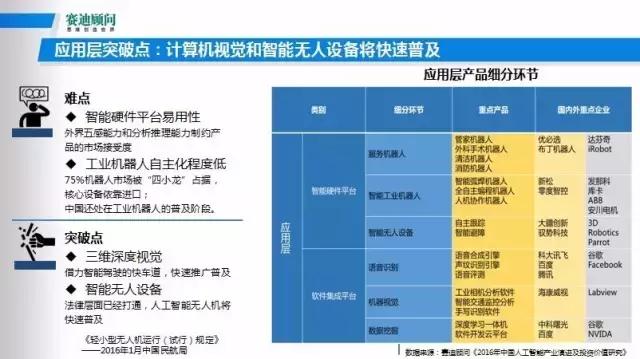 通过对整个基础设施层的深入剖析,包括一些重点厂商和重点行业应用,其实可以看到,基础设施层存在问题。现在很多的传感器,包括一些机器视觉的识别,它的多元数据是很难融合,去协同的,它的数据不能对多元化协同开发,还存在着一定的障碍,这是目前在基础设施层存在的一些问题。我们认为未来的突破,一个是软件算法的快速迭代、快速的更新。在这个层面上中国其实是跟全世界很多国家一样,都处在非常相似的起跑线上,大家对这个算法的突破能力都是非常强的。在软件算法层面是我们未来的重要突破方向。另一方面就是硬件的计算芯片,这是未来的主攻方向,尤其是现在最热门的AI芯片,这是未来重点发展方向。