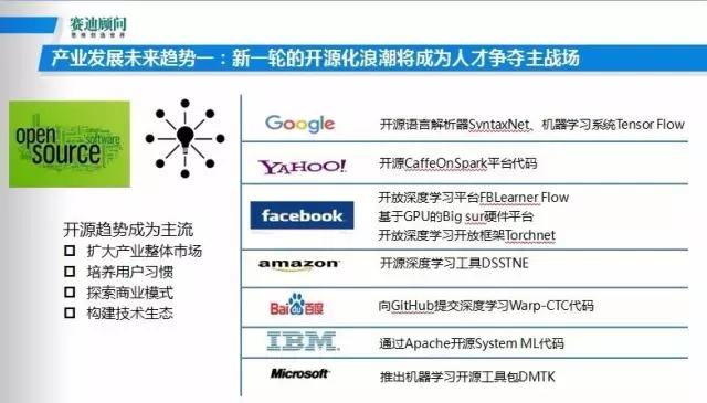 最后为大家分享几个未来的趋势。第一是现在巨头做机器视觉,包括人工智能演进,他们都是呈开元化,这在中国来讲比如华为,对他们来说开源的思路,到底开源怎么用,有很多理念上跟国外还是有一定的差距,很多开源做完代码自己封装自己用了,其实从整个思路来讲,国外开源理念上是更先进的。当然有其背后的原因,很多企业基本上在提交人工智能代码上走着开源化部署道路。