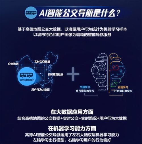 当前,人工智能公交产品最难突破的是两点:模型算法和数据。在大数据应用方面,高德地图的公交数据100%由人工实采验证,覆盖全国超过331个城市,总计7.5万条、158万多公里、近百万站点的公交线路,每条线路都有超过130种线路属性。此外,高德每天监控的实时公交情报超过1000条,10分钟内便可更新上线最新数据。实时公交、实时路况、用户行为大数据则继承了高德的实时数据,为用户规划线路。