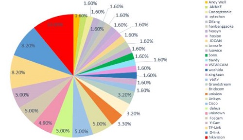 就具体应用领域而言,安防监控是工业互联网的典型应用之一。据CVE、CNVD和CNNVD等漏洞库的数据统计,他们在超过33个厂商的网络摄像头和DVR设备中累计发现了大约61个安防监控设备漏洞。安防监控设备的漏洞主要集中于海康威视、大华、宇视、TP-Link、D-link、Airlive、Cisco等知名厂商。