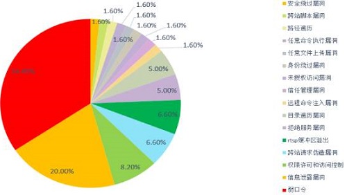 安防监控设备的漏洞的类型多样,漏洞类型主要集中在弱口令、信息泄露漏洞、权限许可和访问控制、跨站请求伪造漏洞等。其中弱口令占所有漏洞中的34.40%,占比最高,而弱口令漏洞也是以Mirai为代表的物联网蠕虫可以大范围感染物联网设备的主因。
